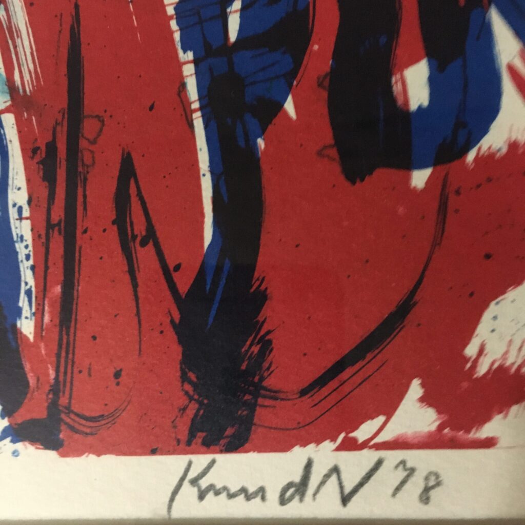 Knud Nielsen: “Abstract” Original lithograph work created in 1978. Signed by the artist. It’s number 172/200. Visible size 30 x 40 cm. Frame goal 46 x 56 cm. Solid golden colored wood frame. 3500 dkr/.470EUR.