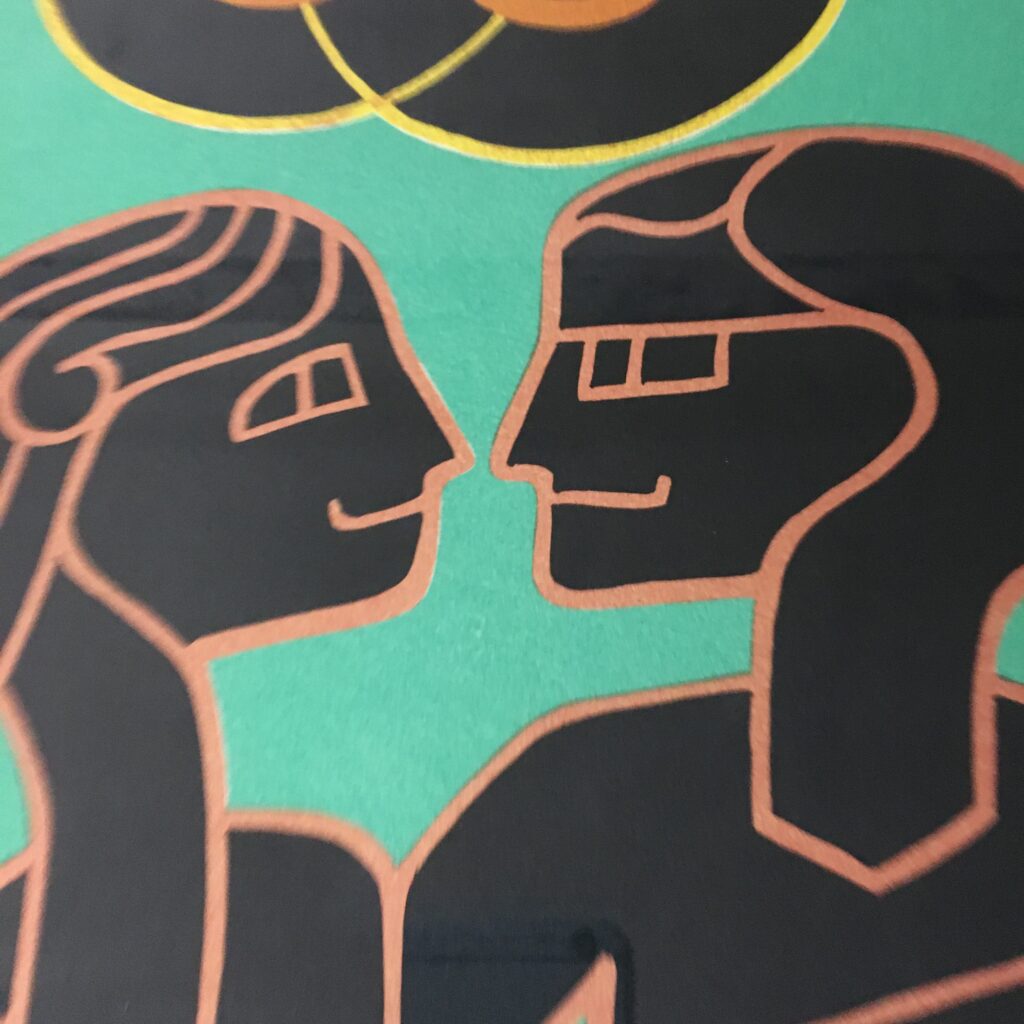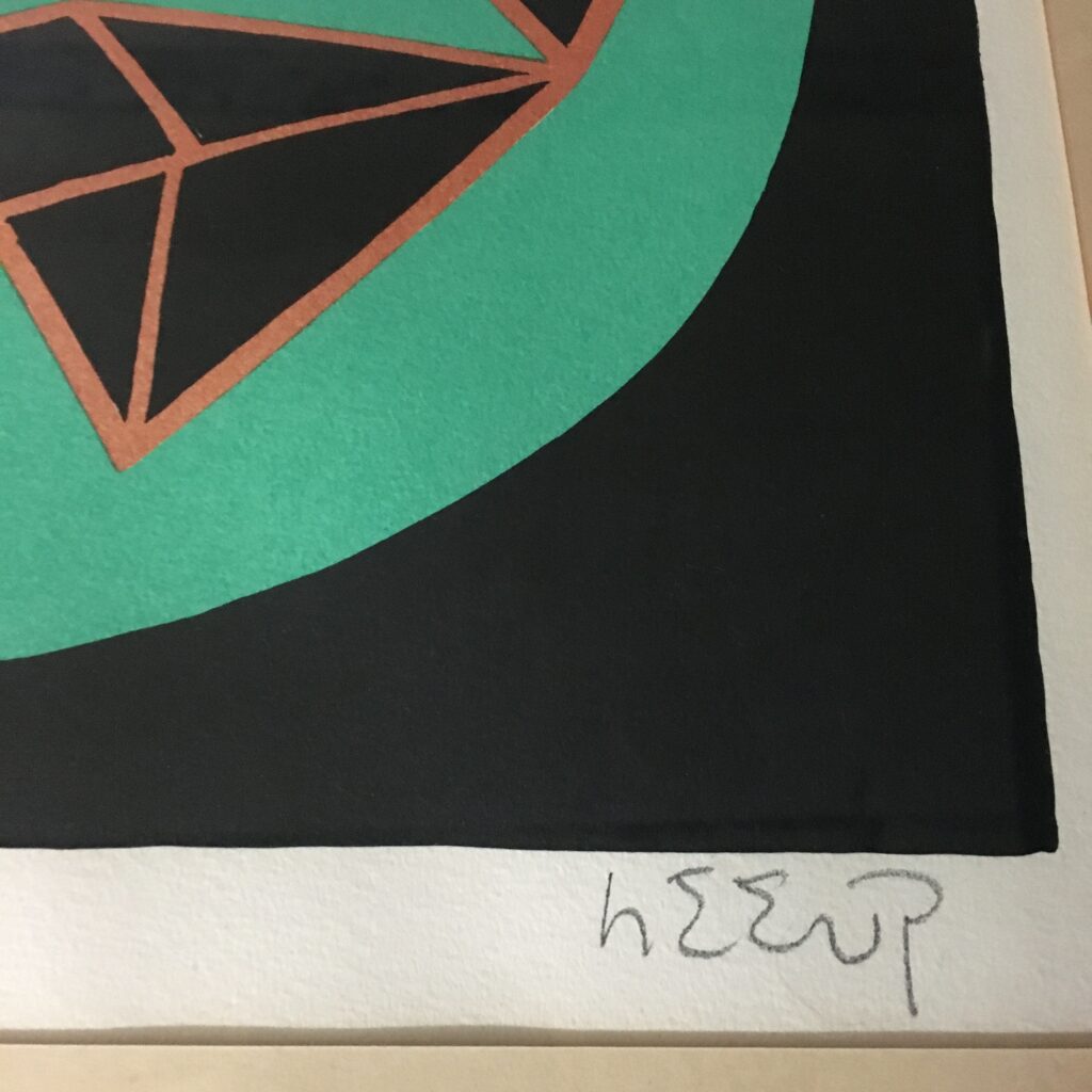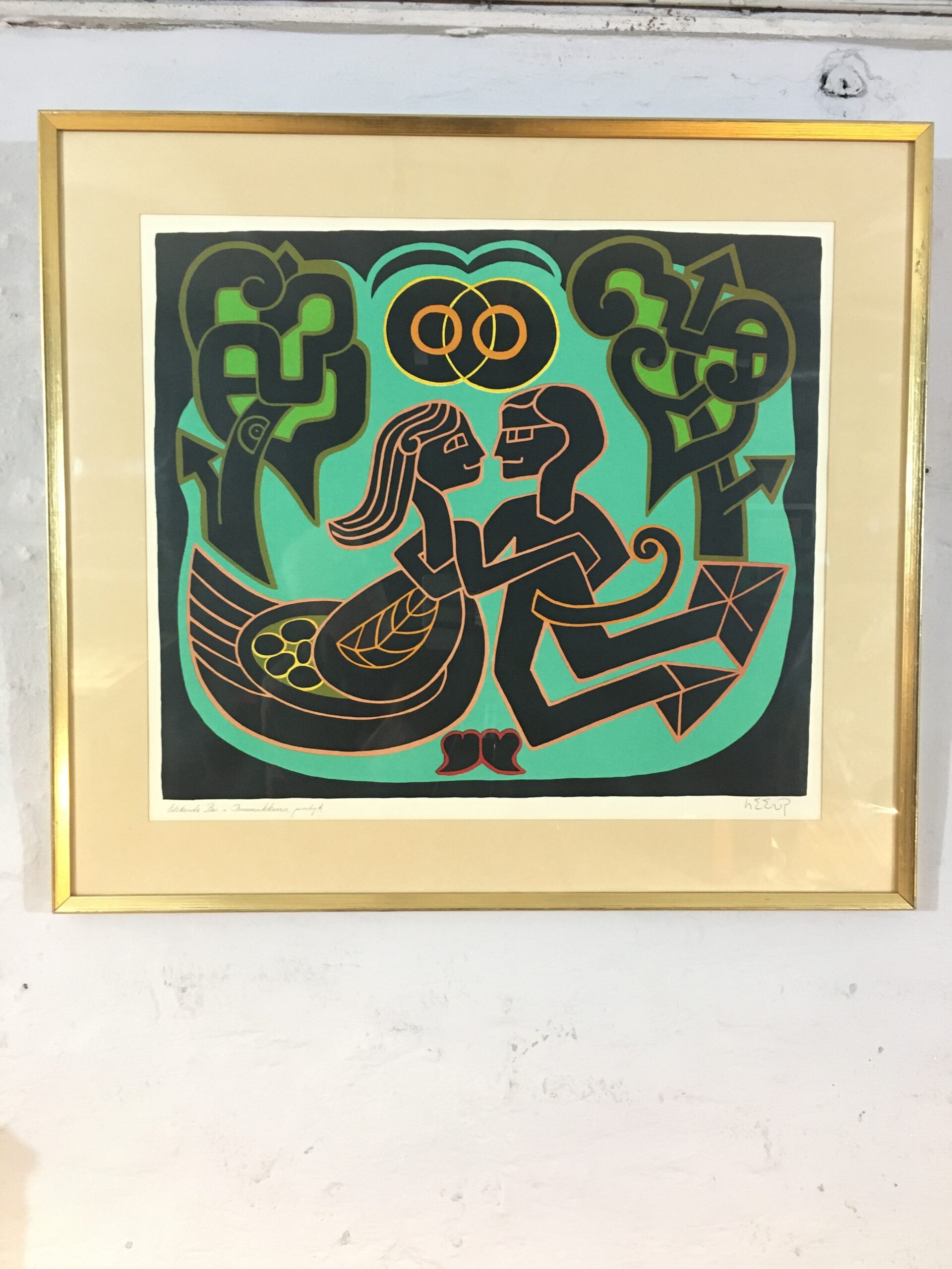 “Loving couple in the ornament forest” is an original lithograph work created in 1975. It’s a unique test print with dedication and signed by Heerup. Visible size 45 x 51 cm and frame goal 62 x68 cm. And with a past par tout and a golden-colored frame with patina. Visit Art Museum: www.heerup.dk . Published by Gallery Modern, Silkeborg, Denmark.