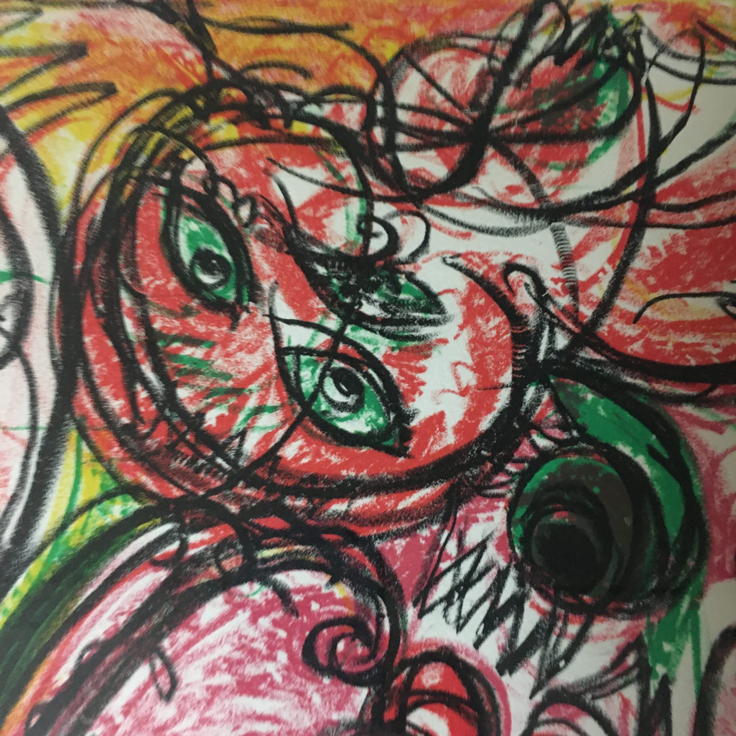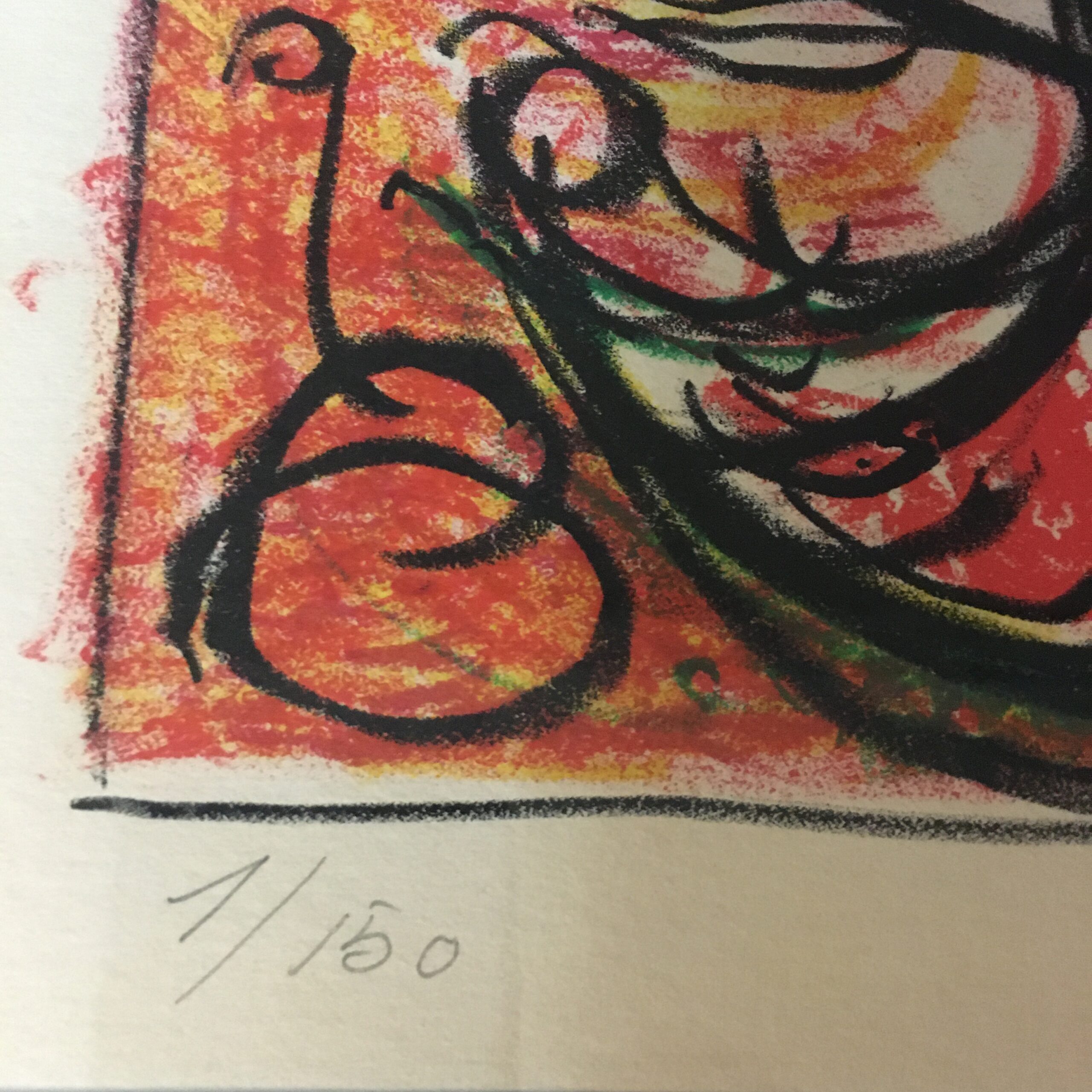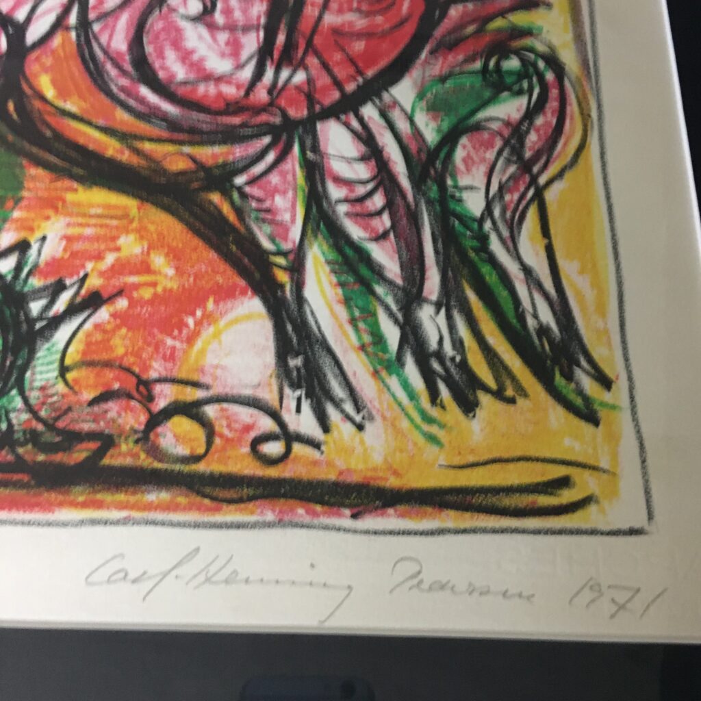 Carl-Henning Pedersen:” Figurkomposition” (” Figure composition”). Signed by Pedersen in 1971. Its no. 1/150. Visible size 47 x 62 cm and frame goal 64 x 78 cm. It’s with passe par tout and solid alu frame. 3900 dkr/535 EUR.