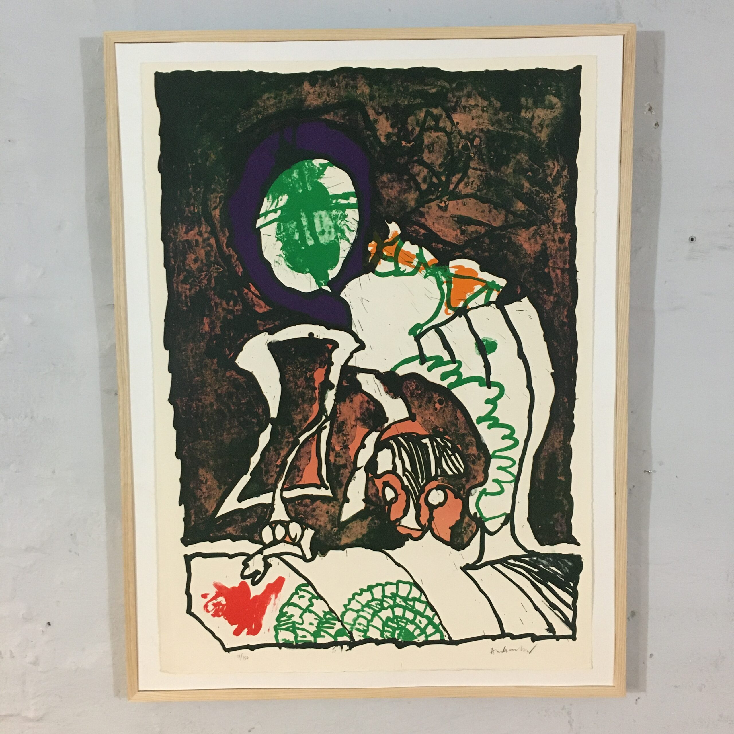 Pierre Alecshinsky: From the map:” Gnomes et Gnose ” (”Green sun”). Original color lithograph print, signed by Alechinsky. It’s no. 18/150. Light frame 76 x 54 cm. Frame goal 83 x 63 CM. Without a frame 16000 dkr/2250 EUR. And with an oak frame 18000 dkr/2450 EUR.