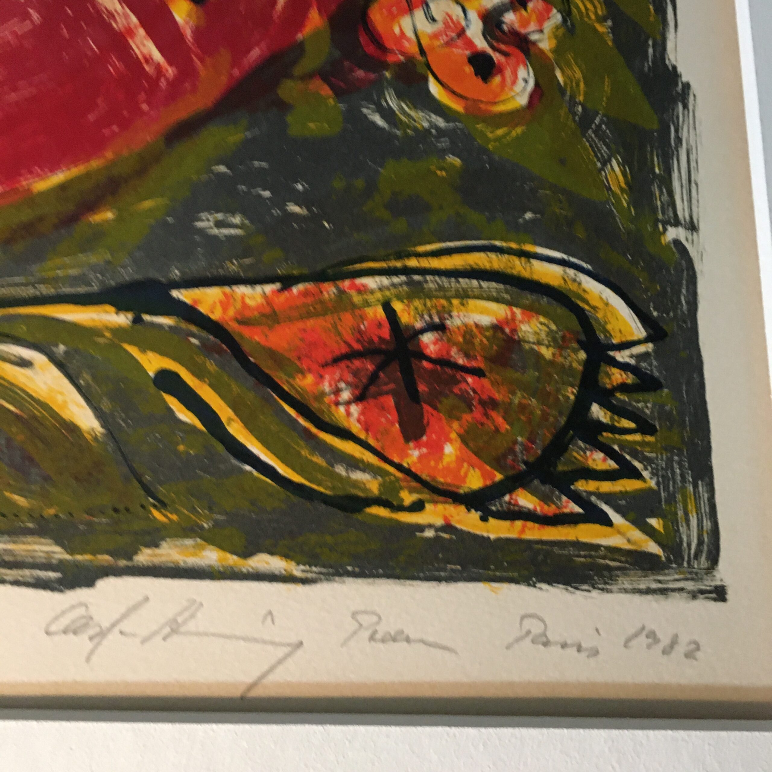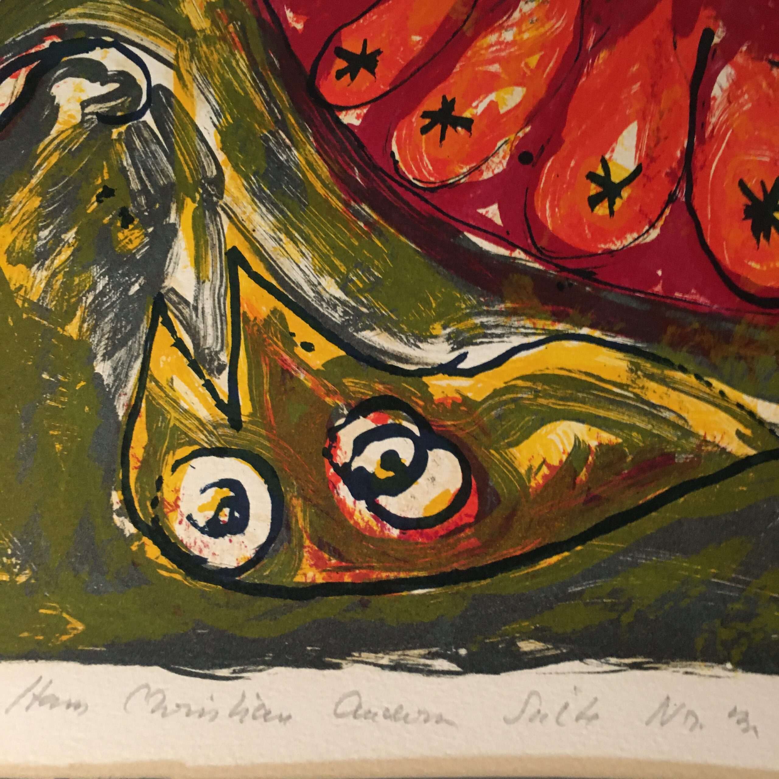 Carl-Henning Pedersen: “H C Andersen suite 3” The legendary artistic work is signed by the artist, “Paris 1982”. Its no. III/XXV and produced in a limited edition. Light target 78 x 52 cm and frame goal 96 x 70 cm. It’s with passe par tout and solid silver colored wooden frame. 8600 dkr/1100EUR.