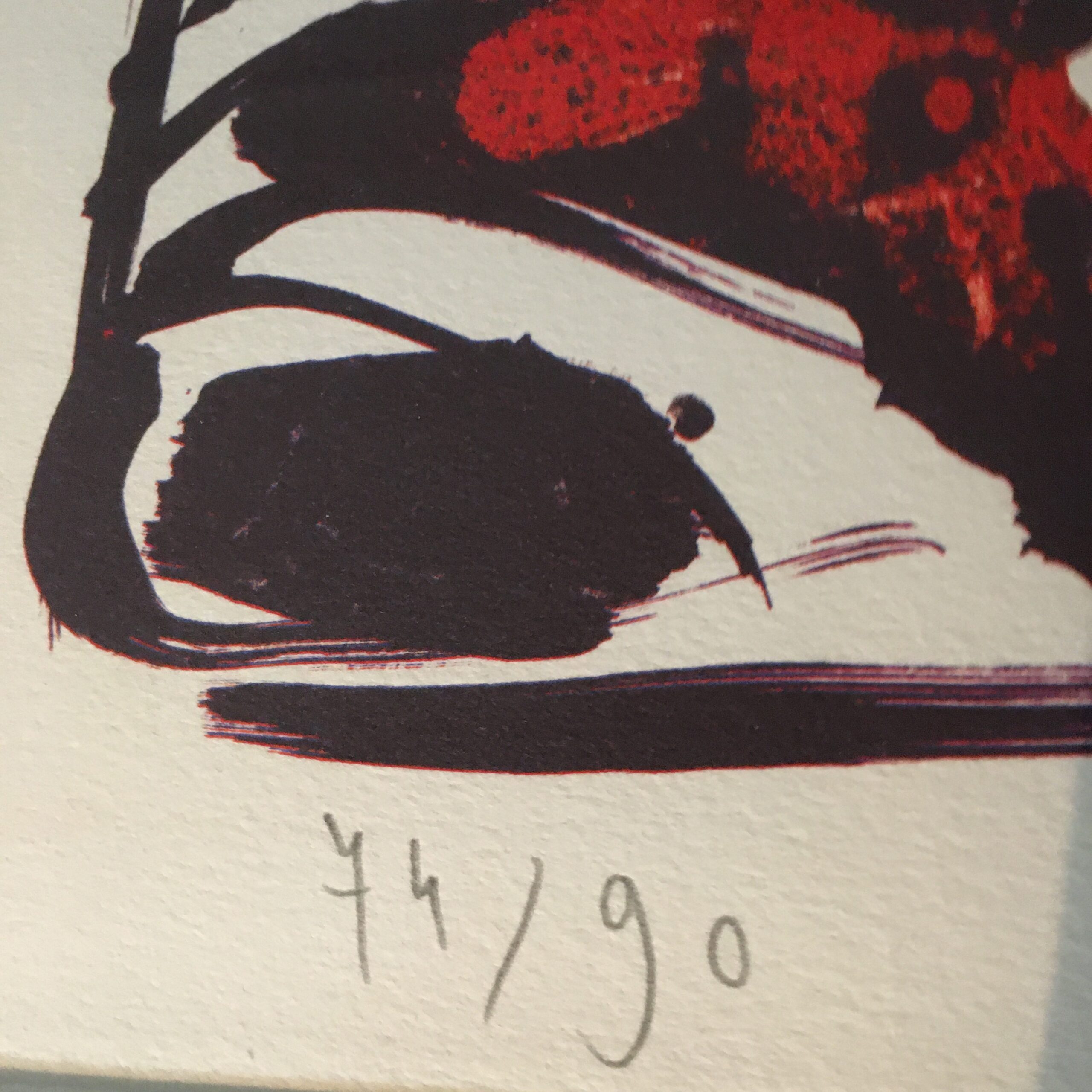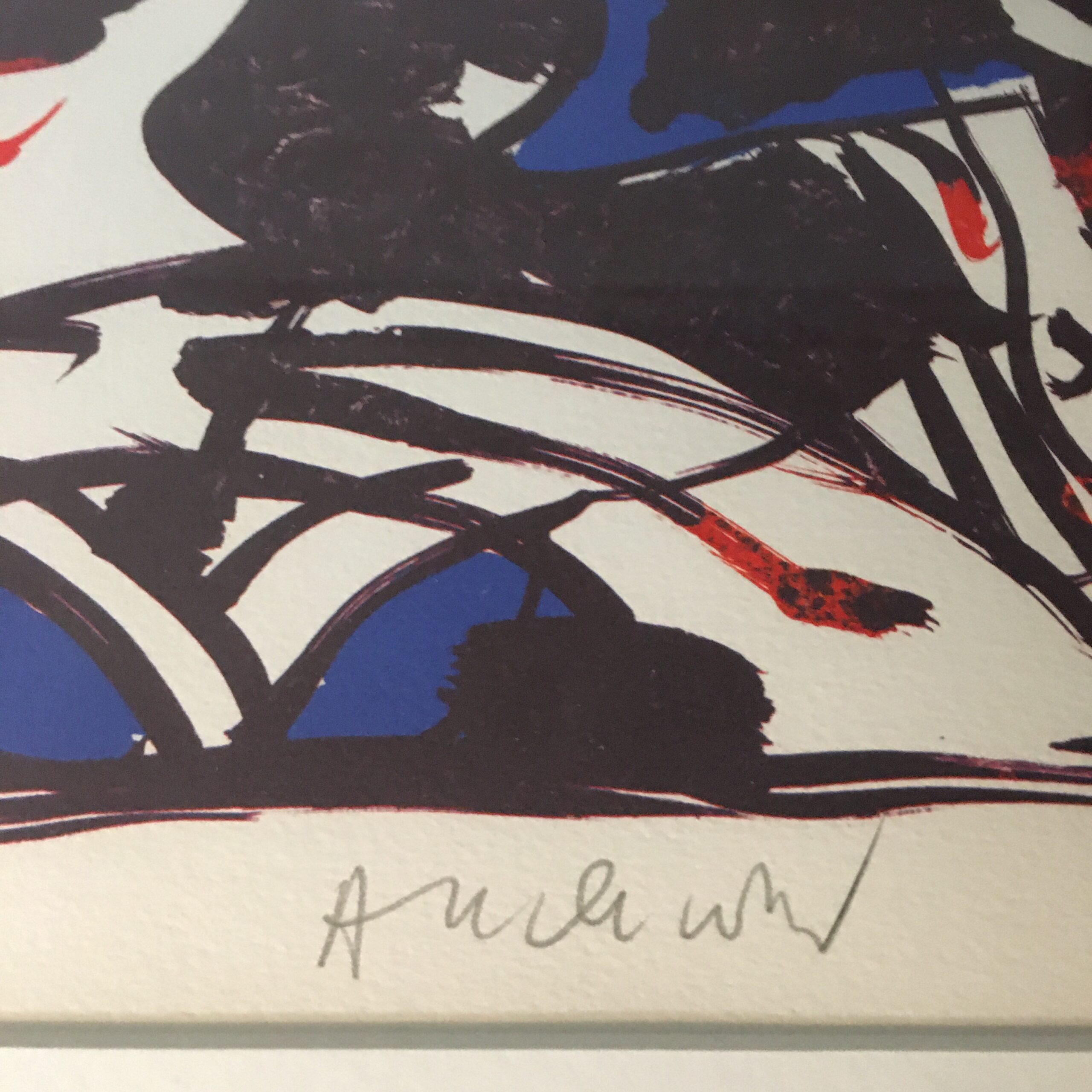 Pierre Alechinsky: “Abre á Fraise” (“Jordbærtræ”). 1994. Signed Alechinsky. Original color lithography. No. 77 of 90 prints. Visible size 77 x 90 cm. Frame goal 80 x 60 cm. Golden wood frame and with passe par tout. 8600 dkr/1250 EUR.