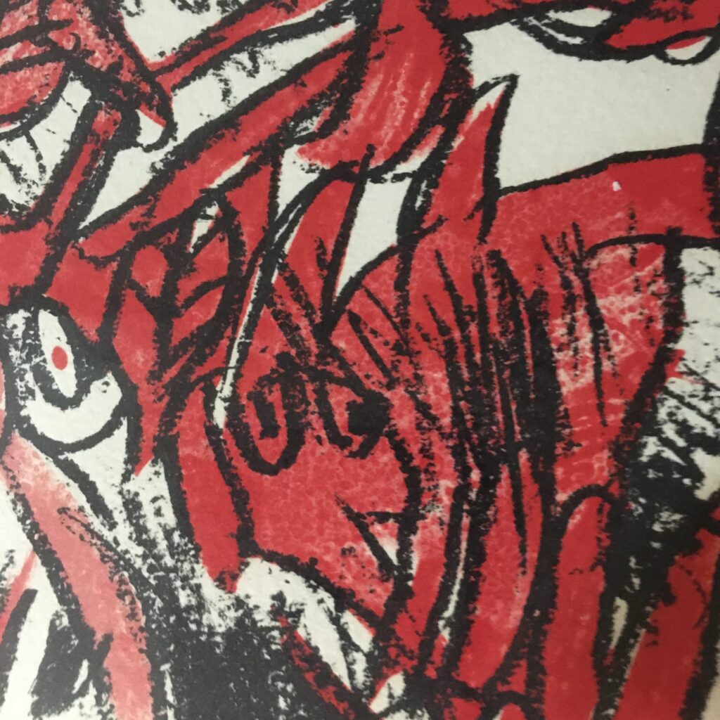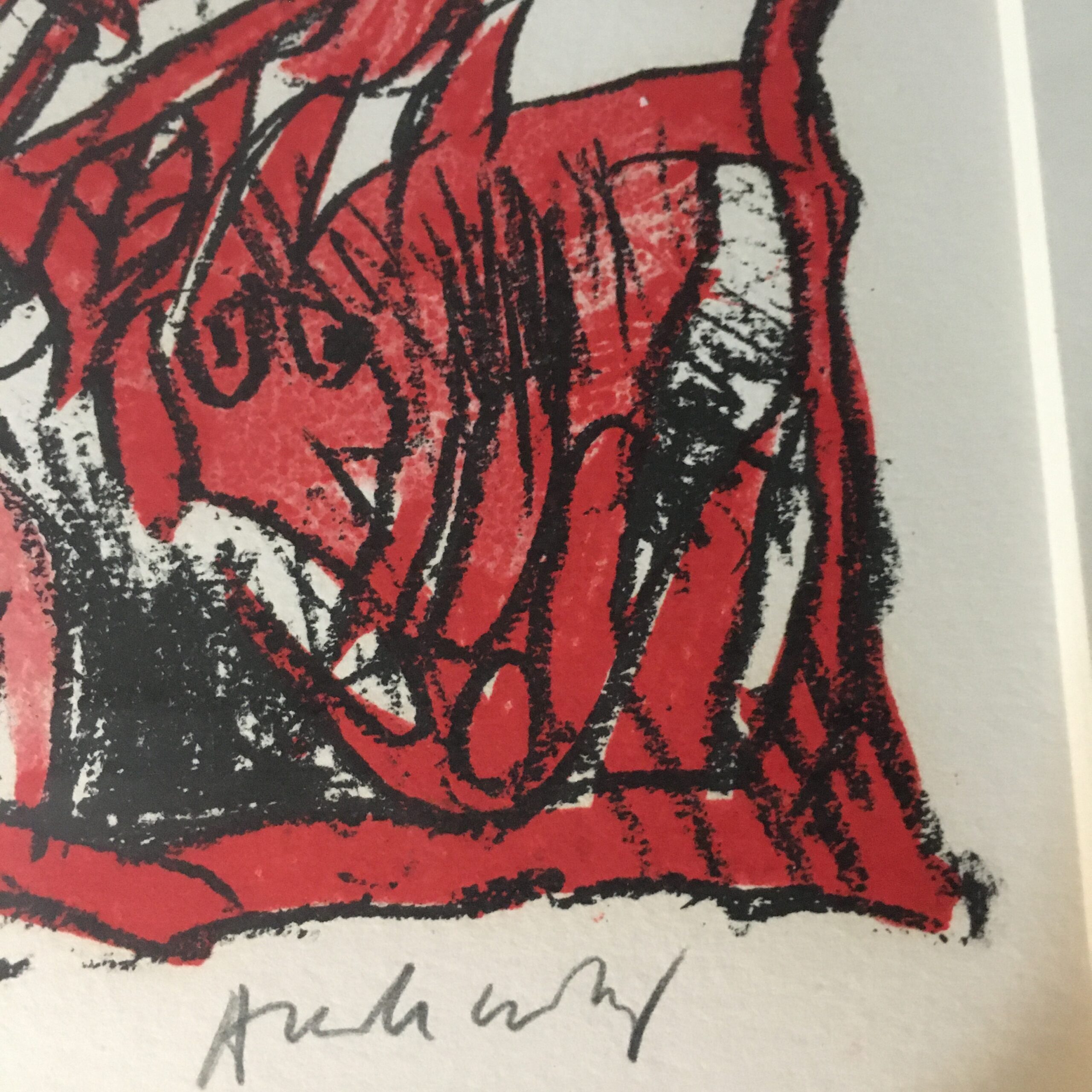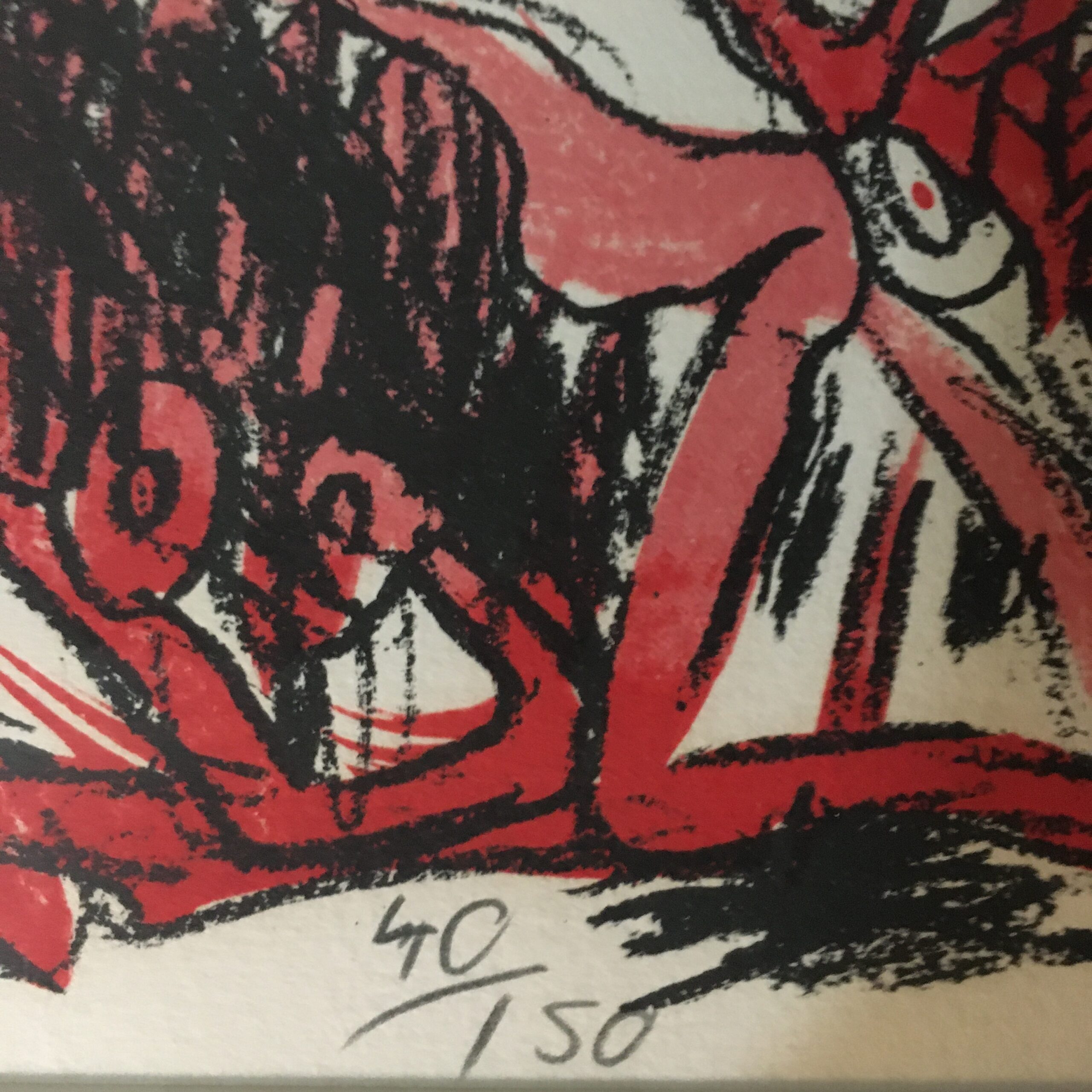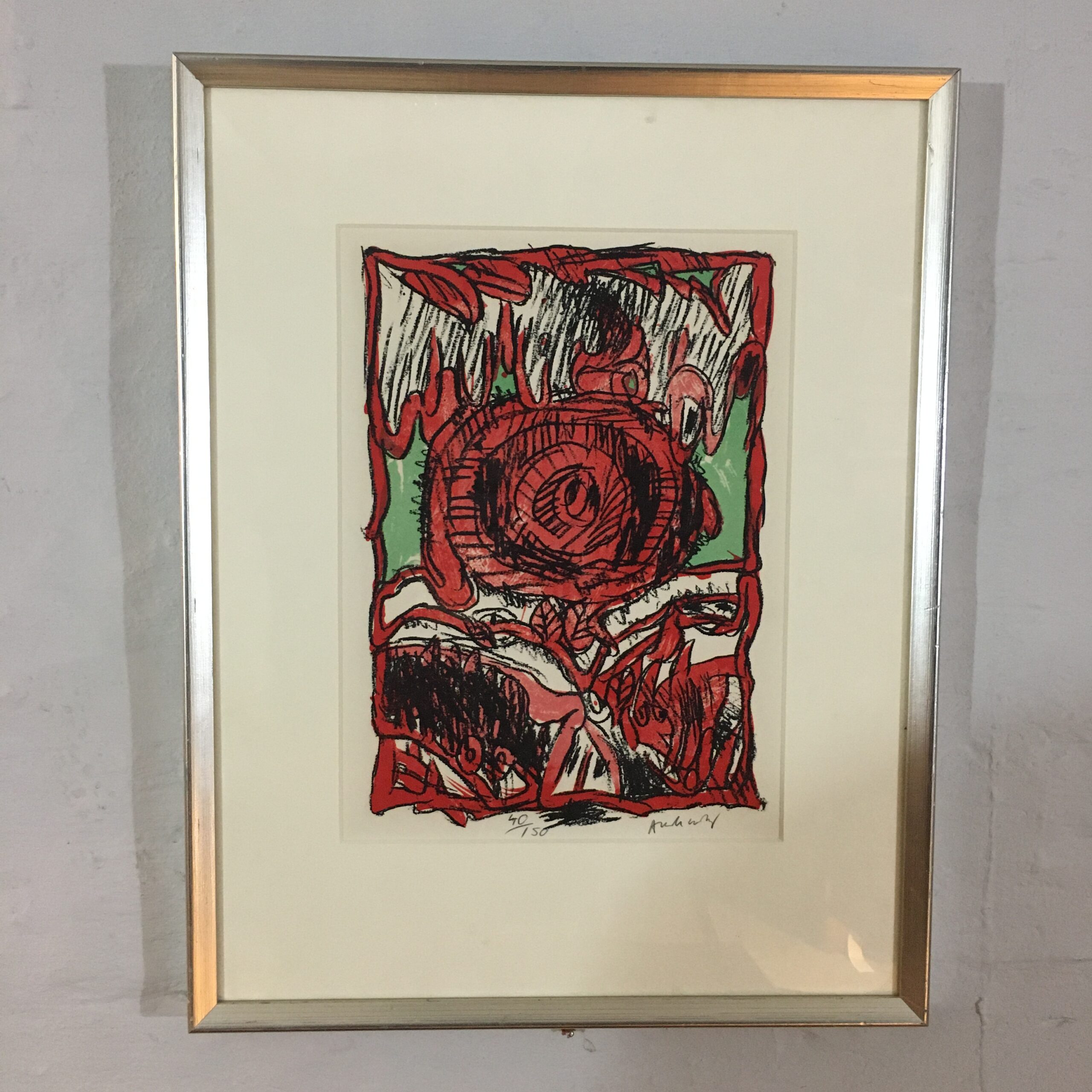 Pierre Alechinsky:” Composition Rose.” Original color lithography work. Signed by Alechinsky. No. 40 of 150 works. Visible size 32 x 23 cm. Frame goal 50 x 39 cm. Silver colored wood frame and with pass par tout. 7900 dkr./1050 EUR.