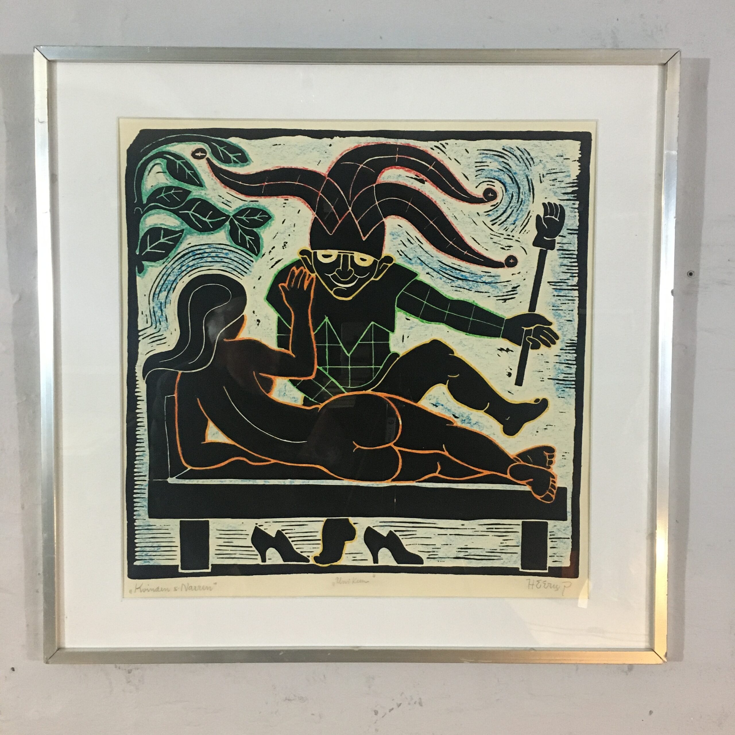 Kvinden og Narren: Dette litografiske værk er signeret af Heerup og som ”Unikum” og håndkoloreret med 3 farver og dermed et unikt værk formentlig fra 1978. Litteratur: Mostrup nr. 179. Lysmål 54 x 57 cm. Rammemål 75 x 73 cm. Og med en oprindelig sølvfarvet træramme med patina.