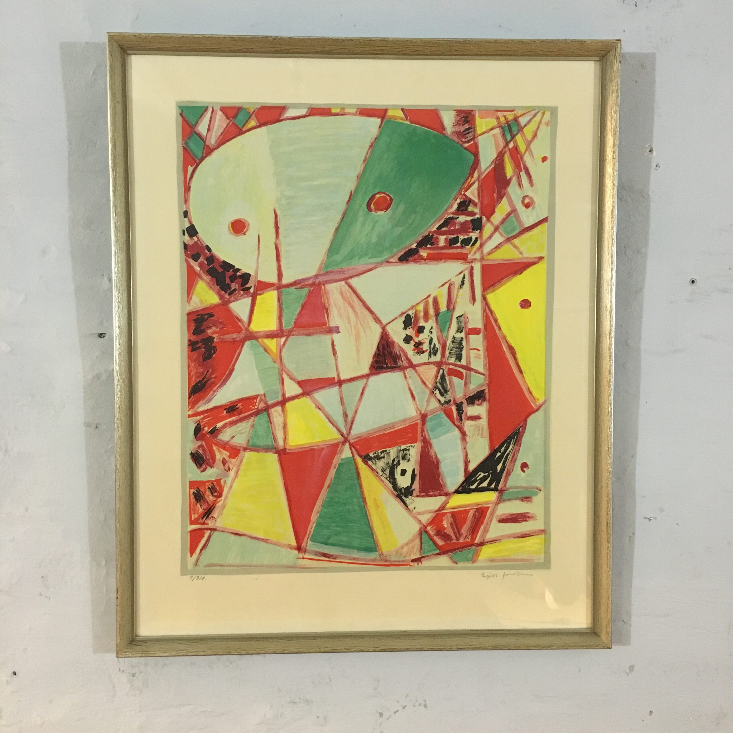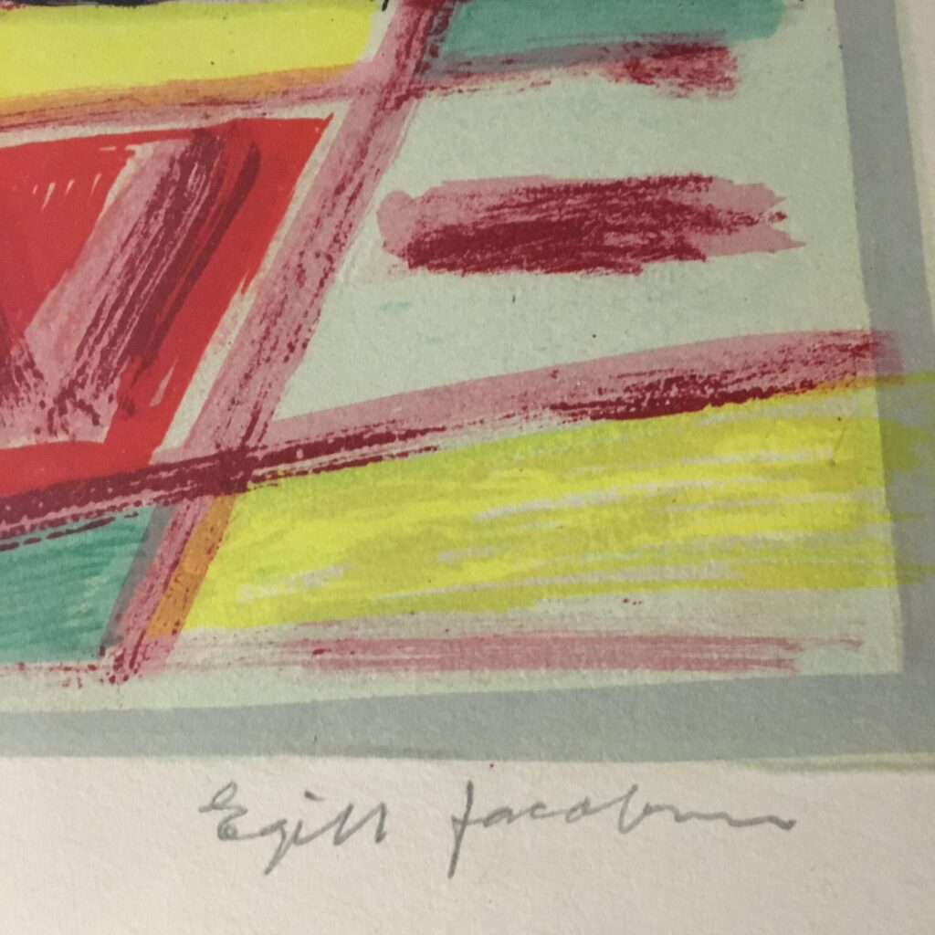 Egill Jakobsen: ”Venlig komposition” (“Gentle komposition”). An original lithographical work created by the Danish artist in the 1980s. No. 9 of 310 prints. Visible size 56 x 45 cm. and frame goal 74 x 54 cm. Passe par tout and a light-colored wood frame. 4600 dkr/600 EUR.