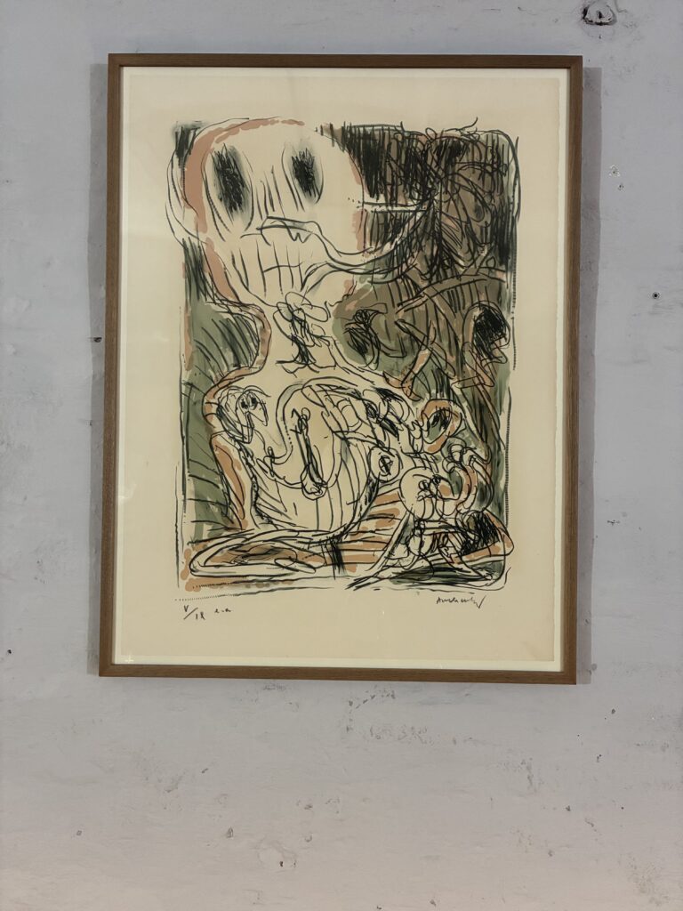 Pierre Alechinsky, “Notre Tradition” is an original color lithographic work, signed by Alechinsky, created 1974. Its no. V/IX. Light frame 72 x 54 cm and frame goal 79 x 60 cm. With open pass part out and an oak frame. 11900 dkr/ 1580EUR.