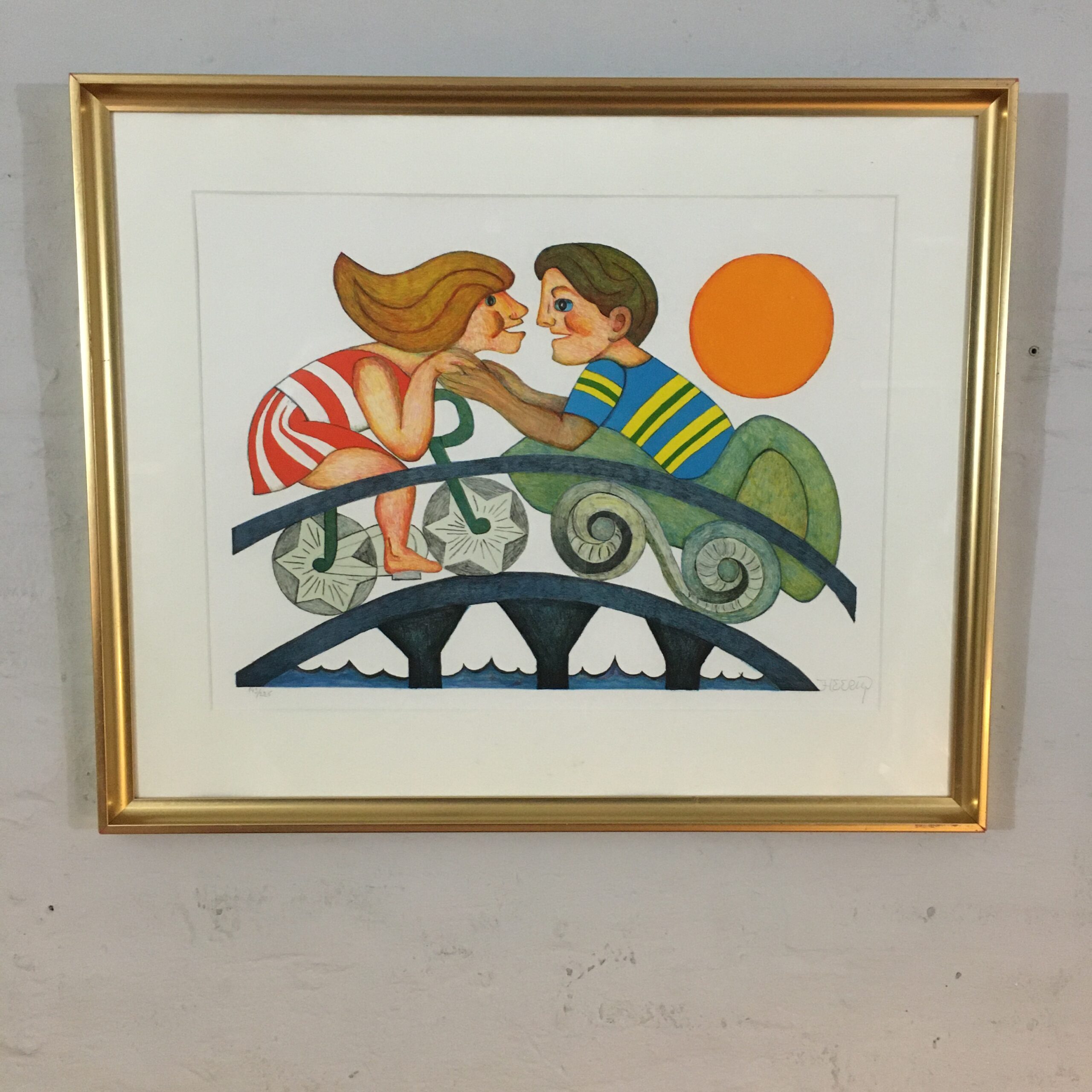 Henry Heerup: “Øresundsmøde” (Cross border love meeting”). An original lithographical artwork by the Danish artist and co-founder of COBRA in 1948, made during the 1970´s. No. 143/225. Visible size t 42 x 56 cm and frame goal 60 x 74 cm. Passe par tout and a golden wood frame. 3900 dkr/520EUR.