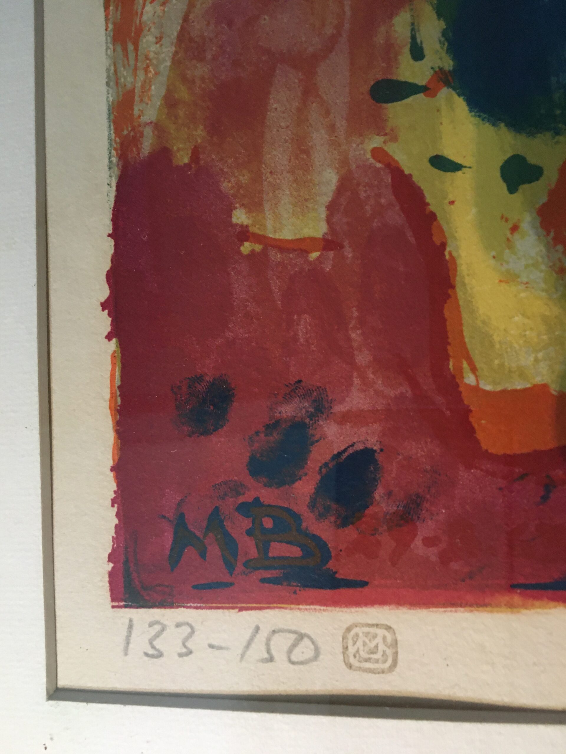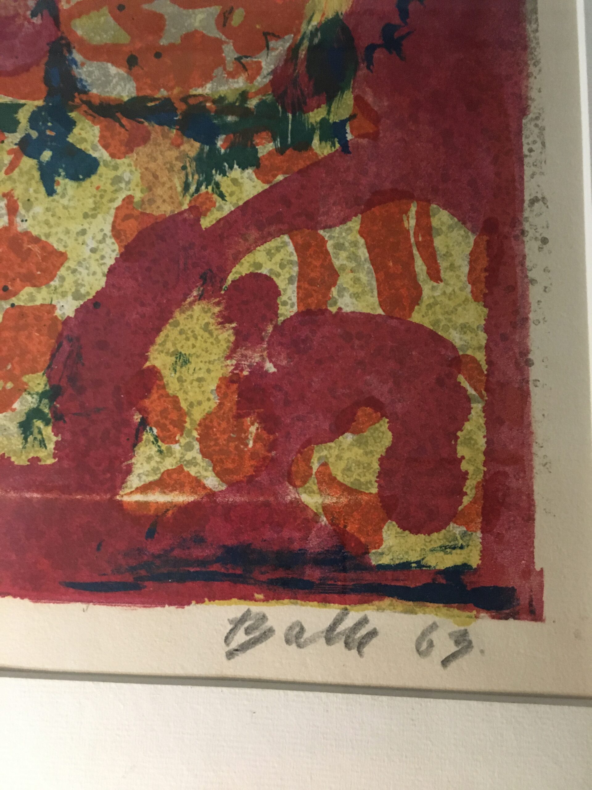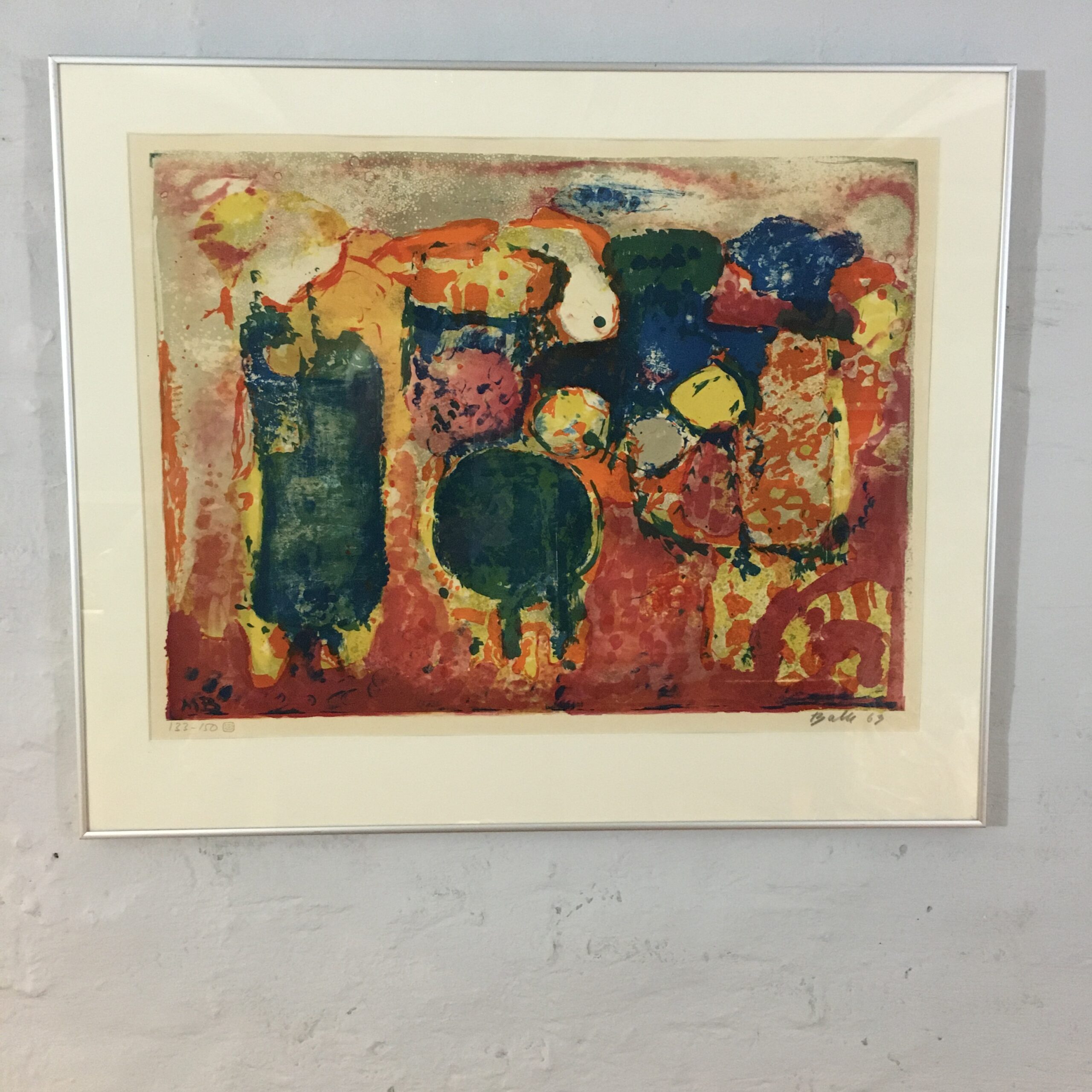 Mogens Erik Schack Balle: “Væsner i rødt” (” Creatures in red”). This original lithographic work was created by Balle in cooperation with the legendary Danish “U M Grafik” (today “Edition Copenhagen”). It’s signed in 1963, “Balle”. No. 133 of 150 prints. Light target 51 x 62 cm and frame goal 65 x 79 cm. It’s with passe par tout and a silver colored alu frame. 2900 dkr/380 EUR.